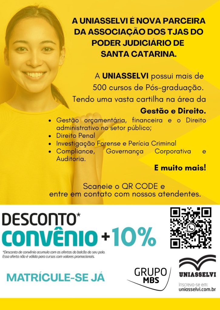 Temos a satisfação de anunciar um novo convênio firmado com a Uniasselvi, uma das maiores instituições de ensino do país, que passa a oferecer condições especiais para os servidores vinculados à ATJ.